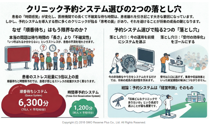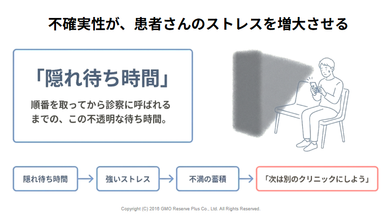 この「隠れ待ち時間」が、強いストレス、不満の蓄積、「次は別のクリニックにしよう」という行動につながっていきます。