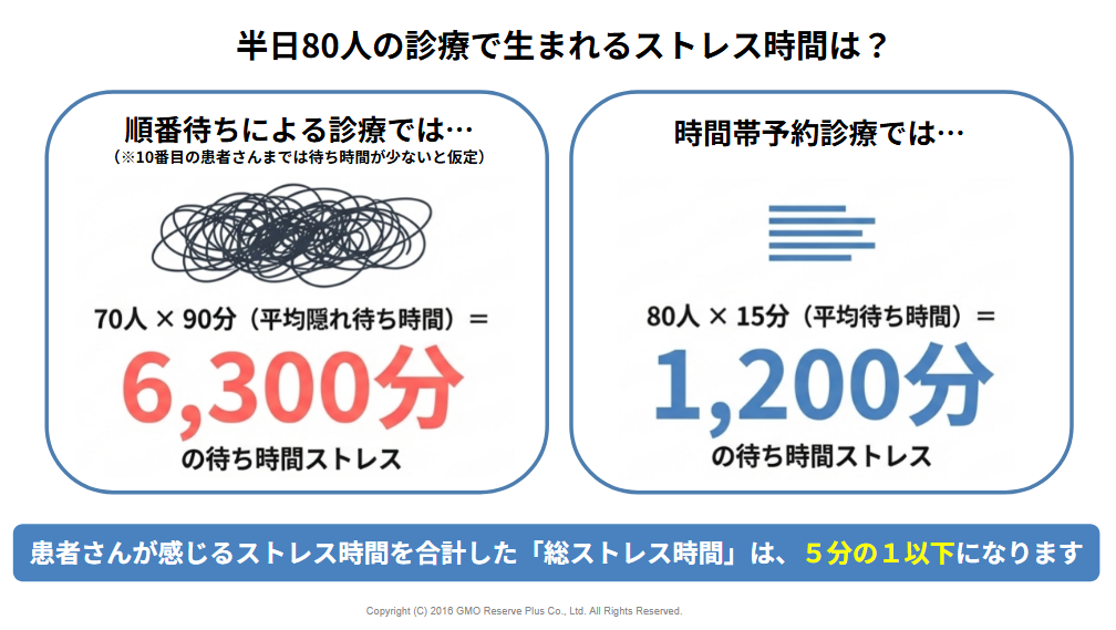 もの待ち時間によるストレス時間が、 たった半日の診療で生み出されていることになります。