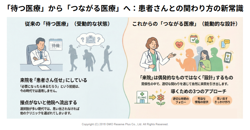 従来は「必要になったら来院する」という前提で成立していましたが、現在は情報も選択肢も多く、何も接点がなければ自然に他の選択肢へ流れていきます。