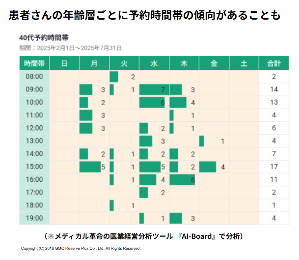 患者さん側からは、「何曜日の何時が空いているか」は見えにくいため、院内でこうした情報を丁寧にお伝えすることで、不人気とされがちな時間帯の予約枠も着実に埋めることができます。