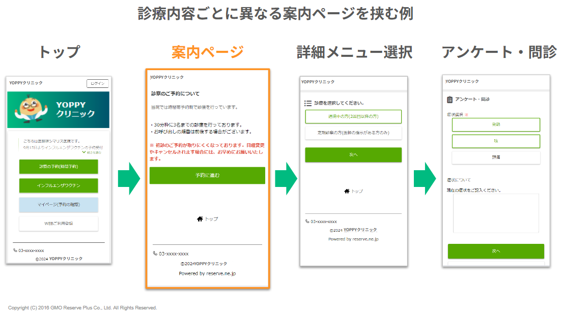 そのような際には、予約操作の途中に案内ページを差し込むことができ、患者さんへのスムーズな情報提供とスタッフの対応負担の軽減につながります。実際に、この仕組みは多くのクリニック様から高く評価いただいています。