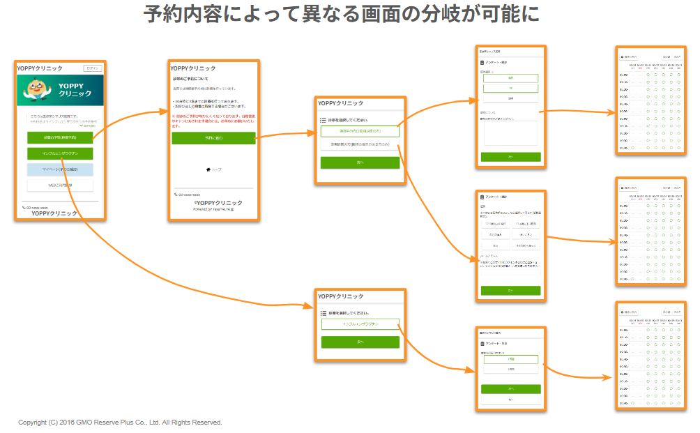 弊社のシステムでは、次の例のように診療内容ごとに「緩急」をつけた予約フローをお作りいただけます。