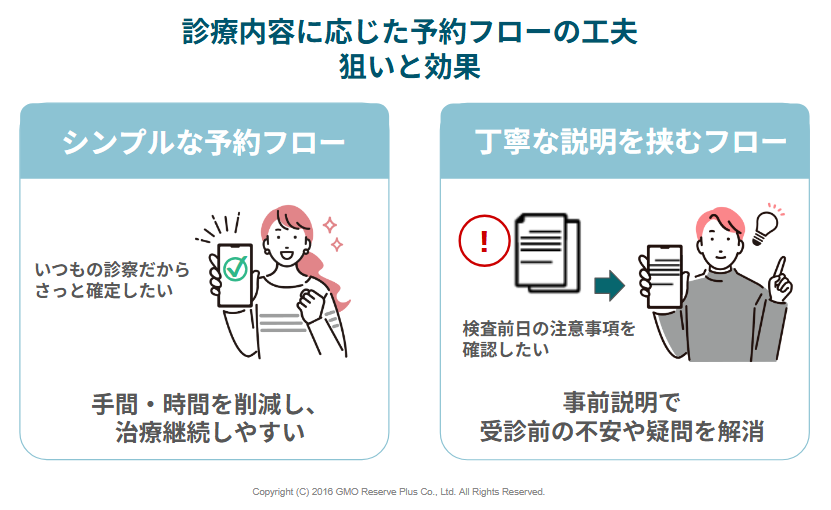 診療内容によっては、簡単なステップで予約を完了できることが最適な場合もあれば、情報を丁寧に確認してもらう場合もあります。