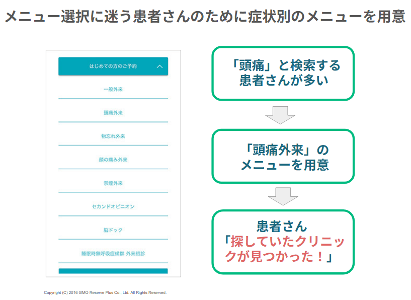 患者さん 迷わず予約できる 症状や目的に合わせて整理されたメニューから、適切な診療をスムーズに選択できる