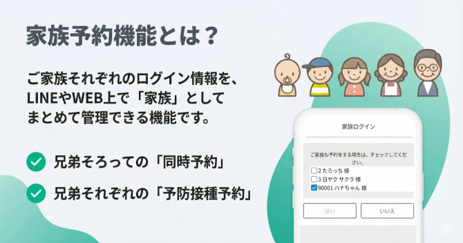 「家族予約機能」は、患者様がご家族(お子様やご高齢の方など)のログイン情報を、LINEやWEB上でまとめて管理できる機能です。