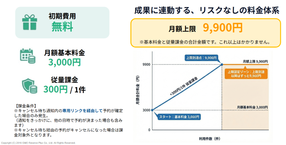 導入リスクを最小限にするため、固定費に加え、実際に予約が確定した時だけ費用が発生する「従量課金制」を採用しました。さらに月額上限も設定されているため、どれだけ予約が入ってもコストが青天井になることはありません。