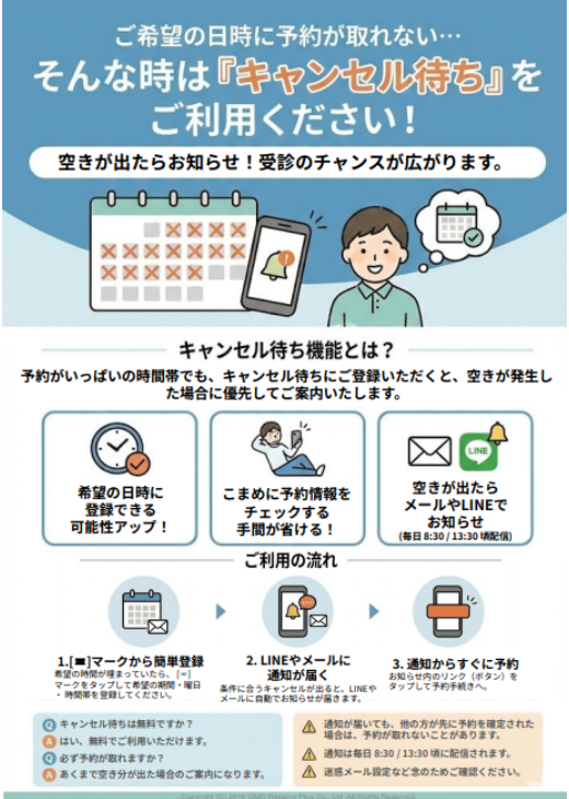 ※リニューアル前のキャンセル待ち機能をご契約いただいている医院様もお問い合わせフォームからご連絡ください。