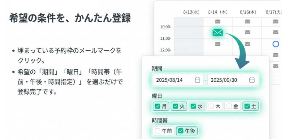 1. 「期間 × 曜日・時間」で幅広く空きを待てる
