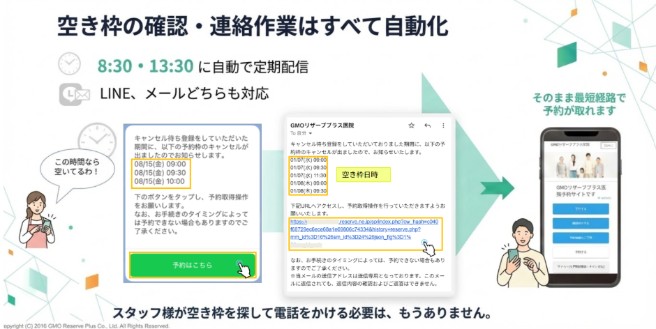条件に合う空き枠が発生すると、システムが自動で検知し、毎日8:30と13:30頃にLINEやメールで患者様に通知を配信します。スタッフ様が空き枠を確認し、電話をかけ続ける業務から解放されます。